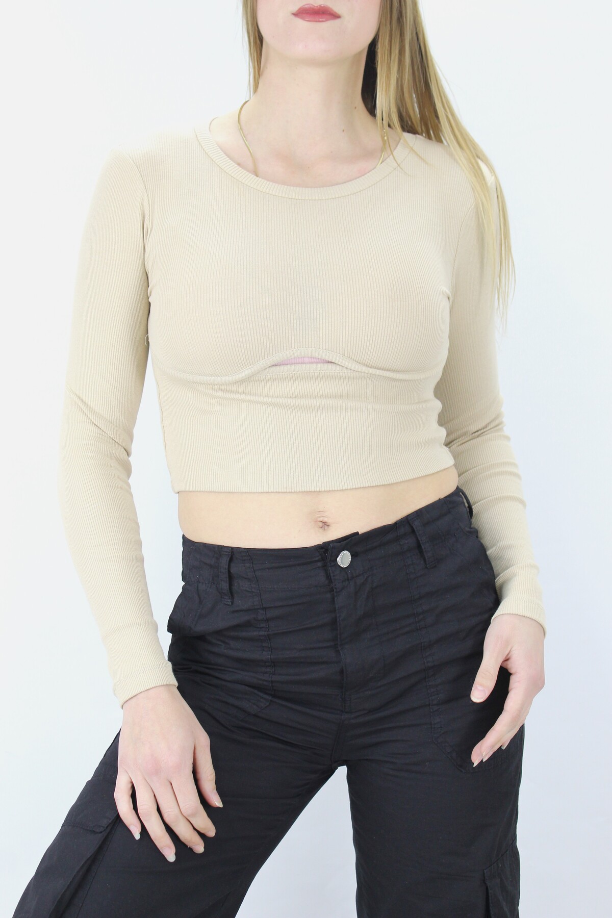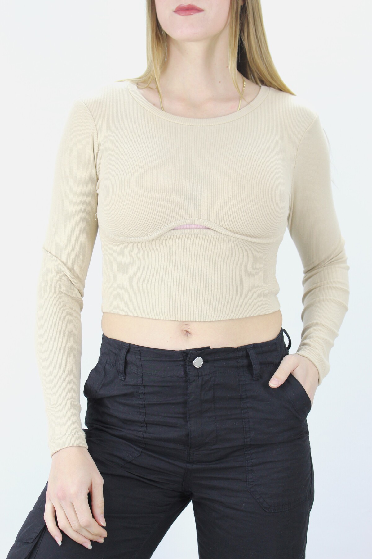 Göbeği Pencereli Kaşkorse Bluz Bej